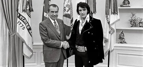 The moment Elvis Presley used his celebrity to persuade President Nixon to make capes the official national fashion accessory. Elvis would die seven years later. Coincidence?