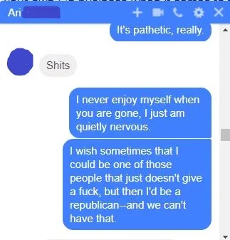 Mostly though, I just feel lonely and anxious this week because my good friend is out on the road, and with the road being the dangerous place that it is these days, I find it hard to focus on assholes in D.C. or the assholes at FOX News.