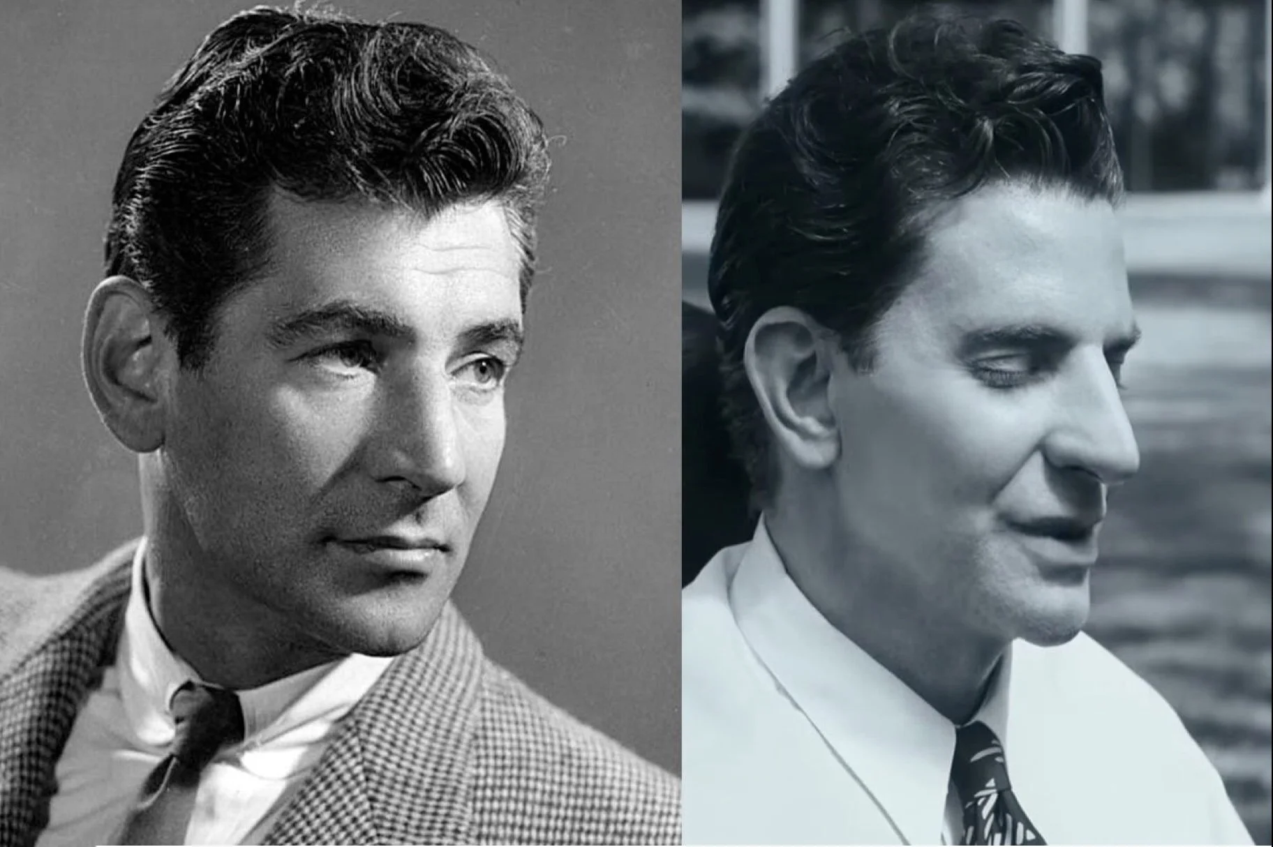 Bradley Cooper, internet villain du jour, and the implicit contention that This is why you shouldn’t let a gentile play a Jew, because they just slap on a big nose because that’s what they think Jews are. Never mind that, from the teaser, it’s apparent that the nose is just one of several cosmetic alterations that Cooper has deployed in the service of making himself look more like Bernstein (a goal that certain shots suggest he has come uncannily close to achieving). The most benign of the charges—that Cooper and the movie simply got the nose wrong—rests largely on a widely circulated side-by-side comparison that juxtaposes an early publicity still with a photo in which a very young Bernstein’s nose was minimized by angle and lighting; other pairings make the prosthetic look far more accurate and sensible. The sterner critique is: He shouldn’t be doing it. Not with a nose, and maybe not at all. It’s insensitive, it’s wrong, it’s treading on turf that isn’t his.
