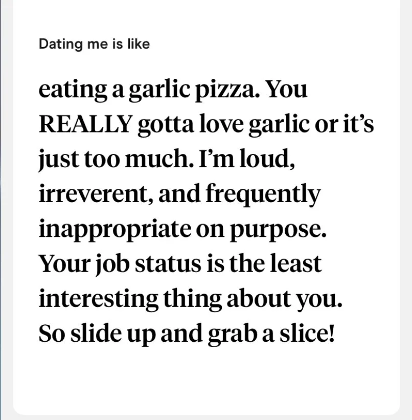I decide to throw up six photos that actually look like me without the goal of being enticing. I write prompts that are as honest I can be about what I'm like in the non-app world.